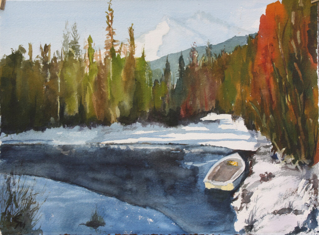Boot im Waldsee und Schneerest