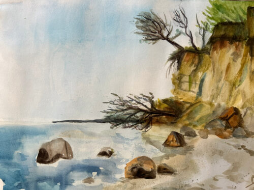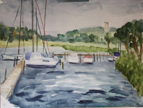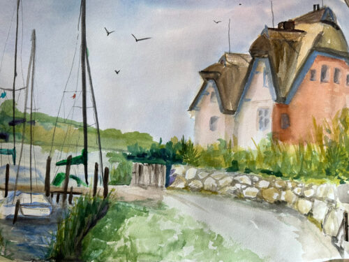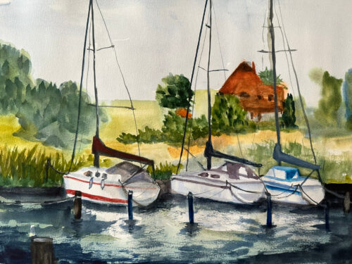 Hafen Seedorf Boote und Landschaft 12. Juli 2024 7. Dezember 2024Aquarell, Landschaften 36×48 Bild Details