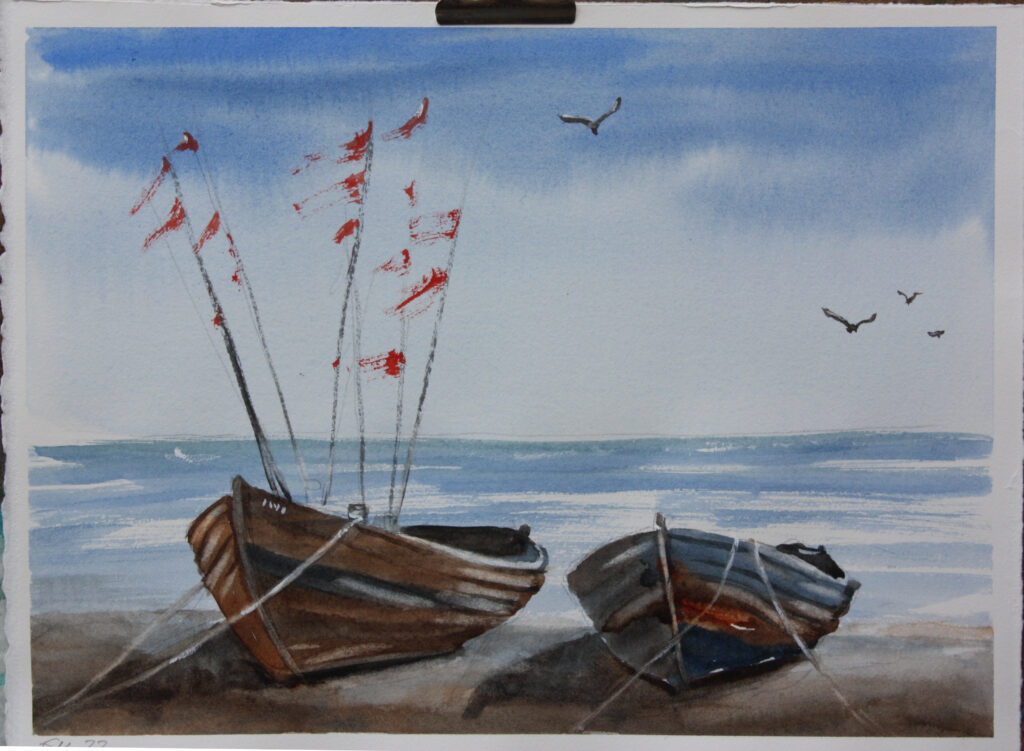 Zwei kleine Fischerboote auf Sand
