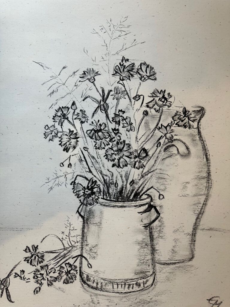 Zwei Tonkrüge mit Blumen